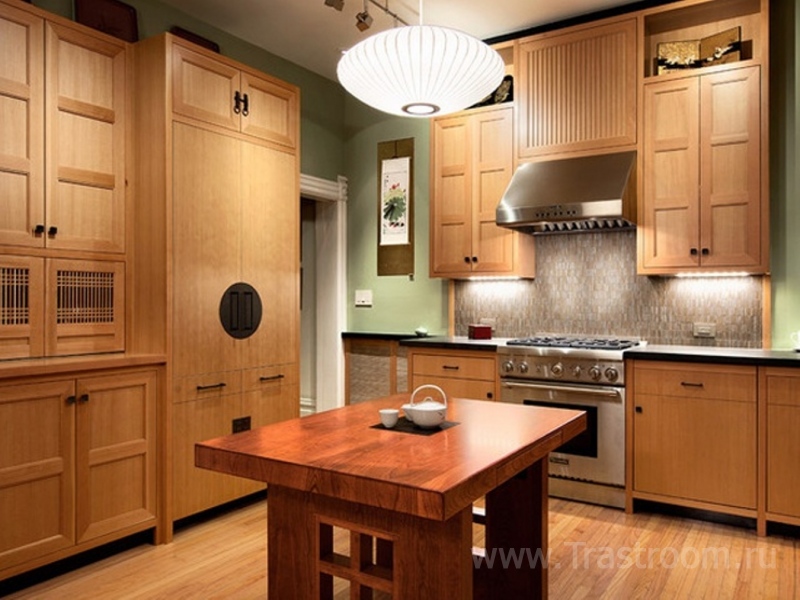 Цветовые акценты расставляются при помощи зеленых, бордовых, черных элементов. В интерьере кухни, оформленной по-японски, преобладает натуральная отделка: