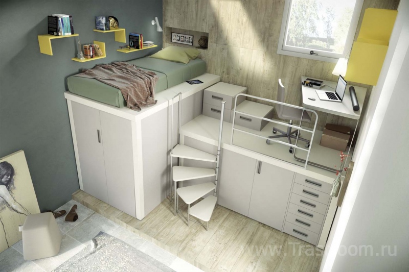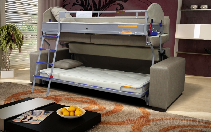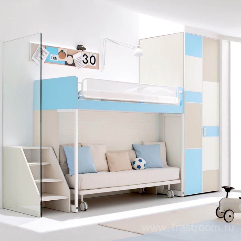 Другой удобный вариант, особенно, если в семье 2 детей, это двухъярусная мебель-трансформер, которая сочетает в себе: