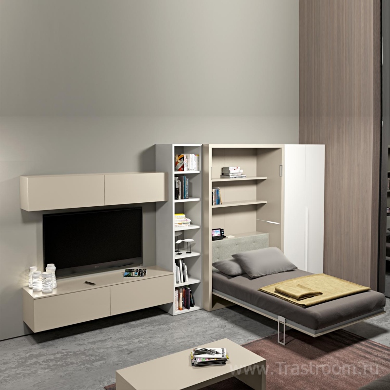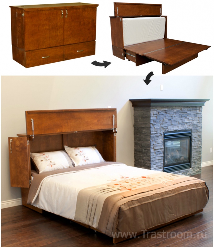 В небольшую гостиную, особенно если это единственная комната в квартире, где надо обустроить и спальню, и кабинет, и место для встречи гостей, на помощь придут откидные, выкатные или раскладные кровати-шкафы и столы-трансформеры.