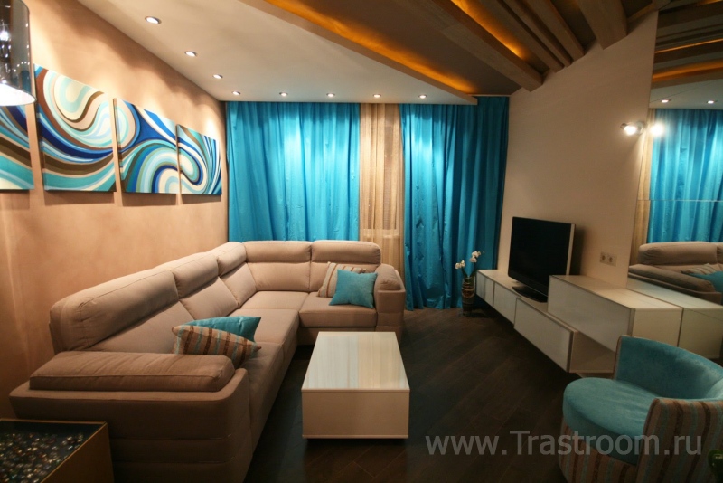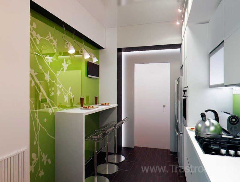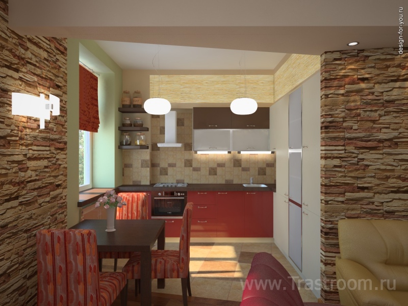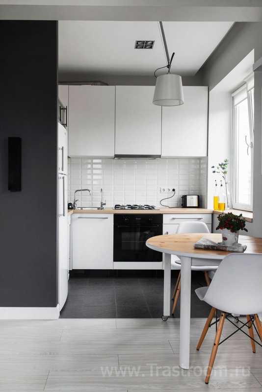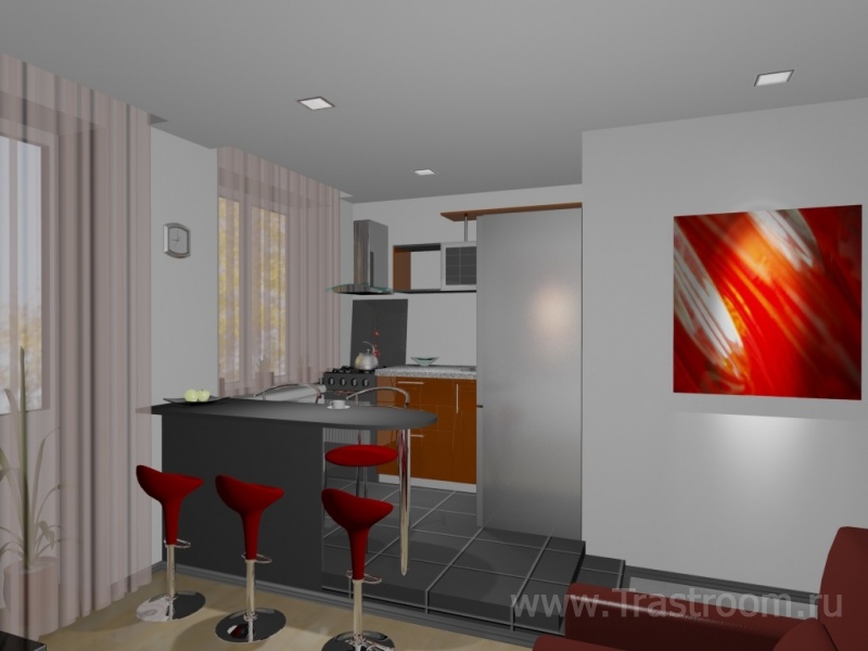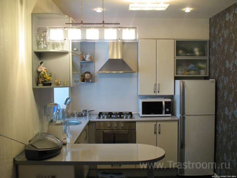 1. Демонтаж стены между кухней и комнатой. В результате увеличится площадь кухни, а сама квартира станет просторнее и светлее. А чтобы все-таки эти два помещения не сливались, их необходимо разделить с помощью отделки или, например, барной стойки. Читайте о дизайне угловой кухне в этой статье. Очень хороший прием зонирования – монтаж гипсокартонных конструкций на потолке или на стенах разной формы и цветов.