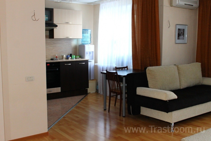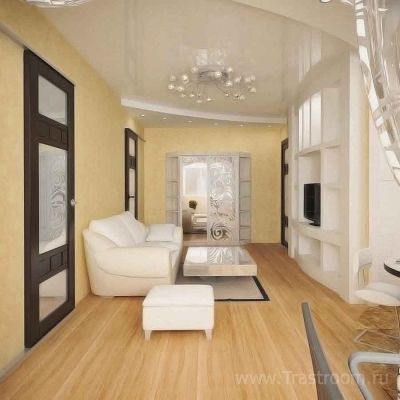 3. Еще один вариант – переместить стену вглубь комнаты, чтобы между залом и спальней получился коридорчик. Таким образом отпадает проблема неудобства смежных комнат, которая особенно актуальна для семей с детьми-подростками.