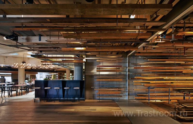 Таким же образом сделаны лестничные пролеты, подход к бару, места для сидения. Другие приемы, использующиеся в этом холле: