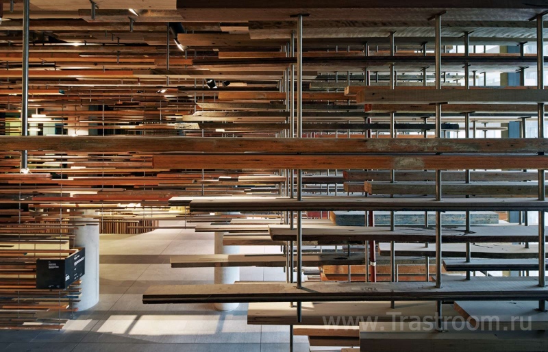 И неспроста, ведь все пространство в нем заполнено панелями из отходов лесоматериалов. Более 5000 деревянных обрезков закреплены по стенам и потолку помещения фойе при помощи металлических стержней.