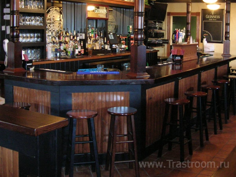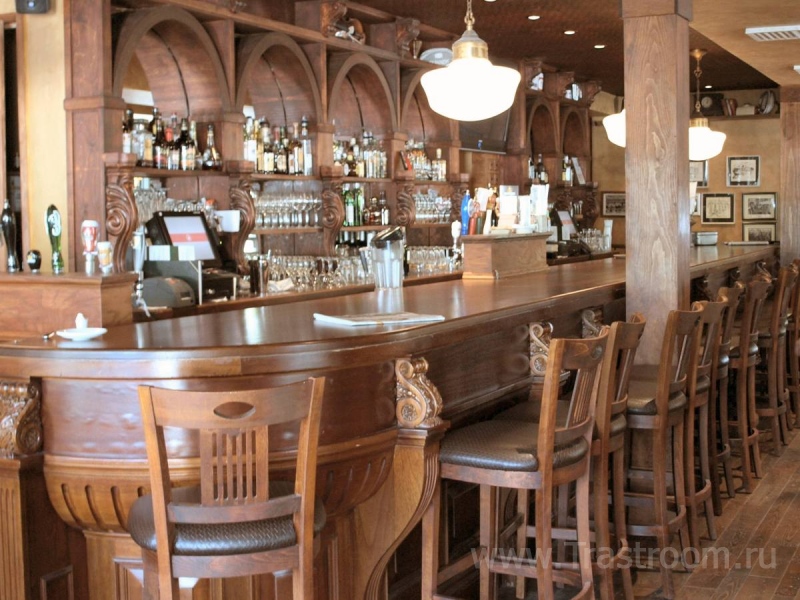 Барная стойка – отдельное «государство» любого ресторана, однако, и она не должна выбиваться из классического стиля. Отделка – из светлого или темного дерева. Потолочное освещение, или красивые торшеры, органично вписывающиеся в общую обстановку. Высокие стулья из дерева с мягкой обивкой и спинками – также поддержат классику в интерьере.