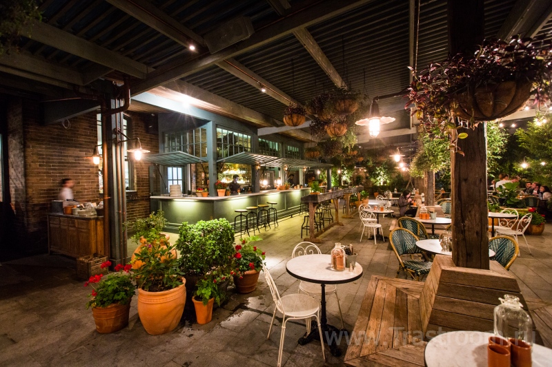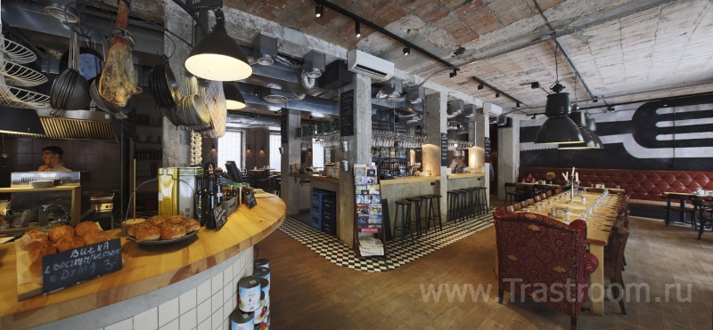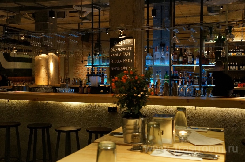 Стиль заведения предопределило само здание, в котором оно располагается. Это был заброшенный хлебозавод, построенный еще в начале 20 в. У дизайнера получилось очень удачно обыграть обшарпанные кирпичные стены, деревянные потолки, бетонный пол, просто добавив к ним другие элементы лофта: