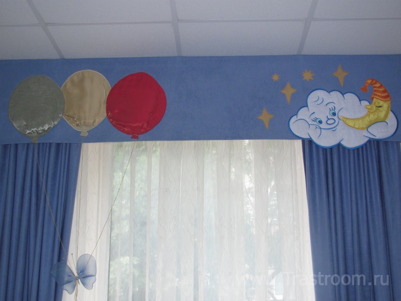 - отвлечь внимание от неправильной формы помещения (яркий ламбрекен и шторы с крупным рисунком).