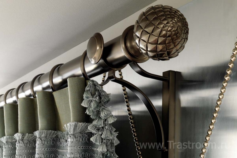 Выбирайте нестандартный карниз так, как если бы Вы подыскивали аксессуар к наряду. Он может быть ярким и выделяющимся, гармонируя с каким-либо другим предметом интерьера. При этом шторы лучше выбрать максимально спокойные. Такой вариант отлично впишется, например, в спальню, оформленную в светлых тонах.