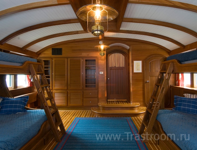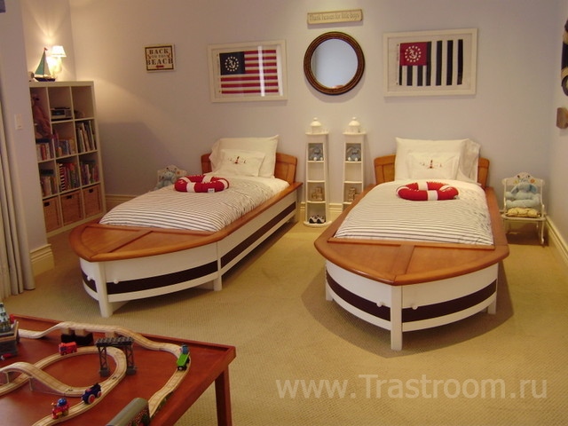 1) Кровать в виде яхты – изысканный вариант. Отделка богатая, с позолотой. Кровать не очень высокая, имеет низкие бортики, может дополняться мачтой с парусом, флагштоком, штурвалом и прочими деталями.