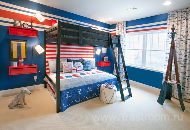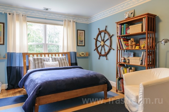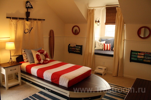 Корабль-кровать – наилучший вариант в комнату ребенка, где в интерьере преобладает морской стиль. Сопровождают его голубые, белые, синие тона, обилие элементов в полоску, натуральные материалы в оформлении – лен, дерево, бамбук, а также корабельные аксессуары.