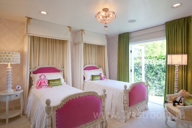 - Для 2-х девочек организовать пространство несколько сложнее, поскольку маленькие принцессы часто более требовательны к окружающей обстановке, аксессуарам и мелочам. Естественно, что цветовое оформление помещения будет более нежным и романтичным, нежели в мальчишеской комнате. Различные детали «как у взрослых» - комодики, зеркала и пр. – отлично впишутся в детскую для девочек.