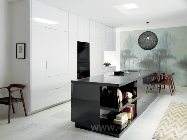 Стены периодически придется мыть, иначе наш хай-тек исчезнет под слоем жира и копоти. Наилучшим материалом для отделки стен на кухне служит керамическая плитка, лучше глянцевая. Вполне подойдет и окрашивание водоэмульсионной или акриловой краской. Если поверхность стен далека от идеала, их можно оклеить обоями под покраску.