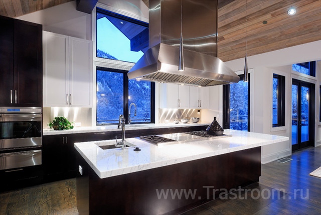 Очень удачным приемом в стиле хай-тек при условии большой площади помещения будет устройство острова – рабочей зоны, размещенной в центре кухни.