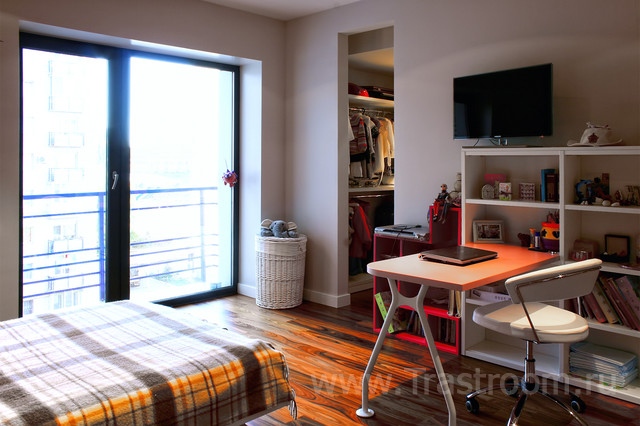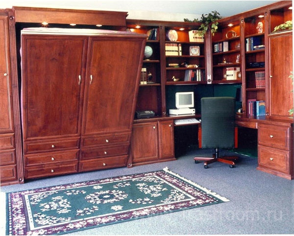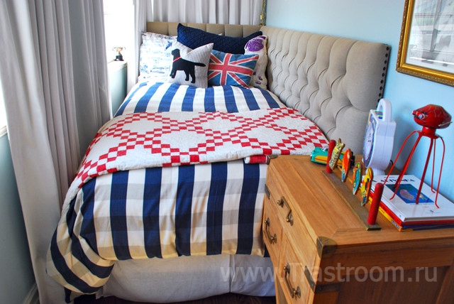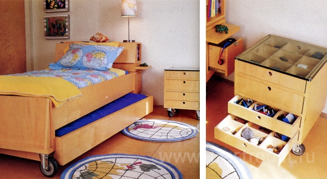Подкроватное пространство тоже можно использовать с пользой, обустроив там полки, выдвижные ящики и т. п.