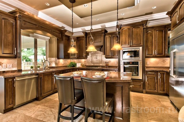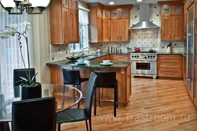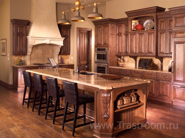Если она еще и резьбой украшена, то кухне можно смело назвать эксклюзивной. В современных деревянных гарнитурах предусмотрены места для установки бытовой техники.