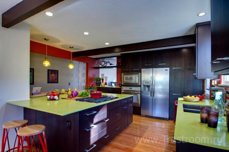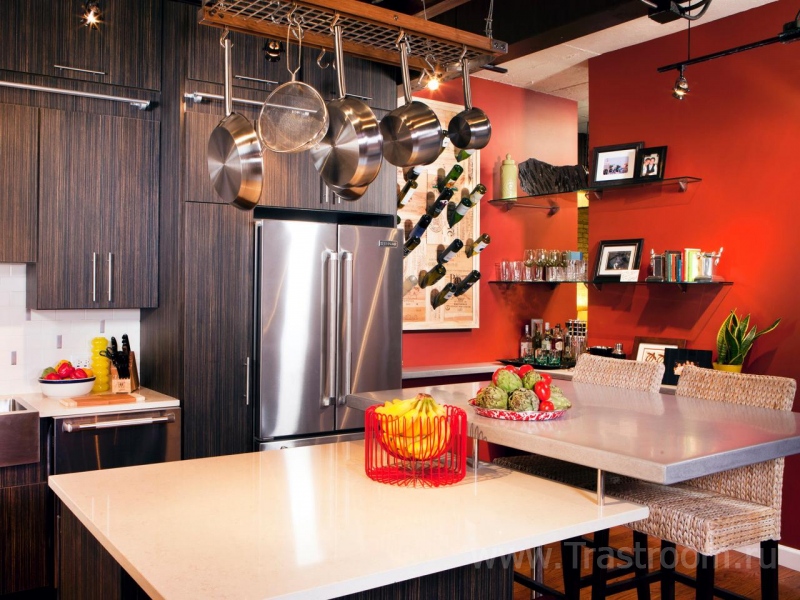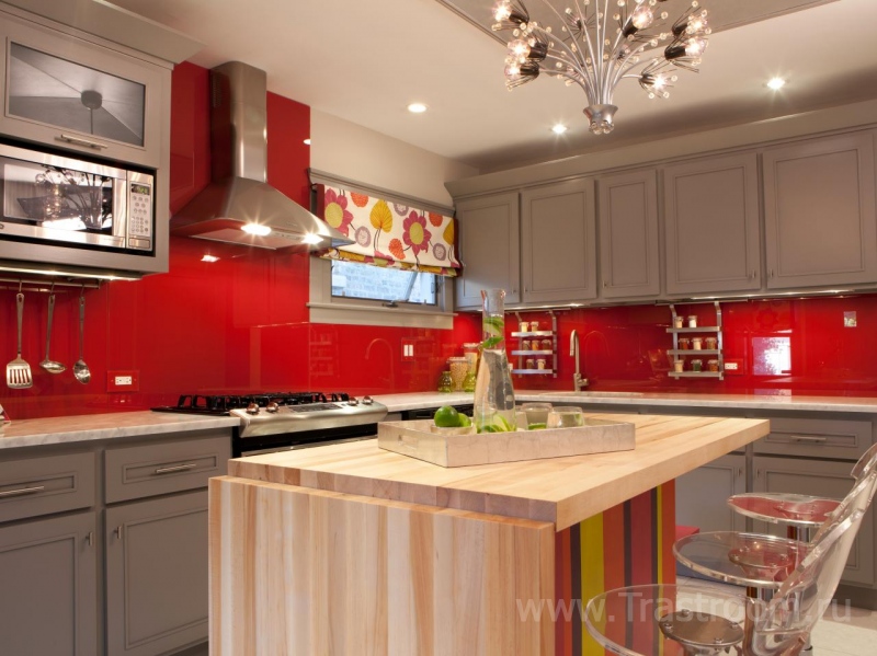 Другой модный способ – это сочетание яркого, красочного фона для кухни (путем окрашивания стен в сочные, неожиданные оттенки) вместе с декором и гарнитуром спокойных, пастельных оттенков.