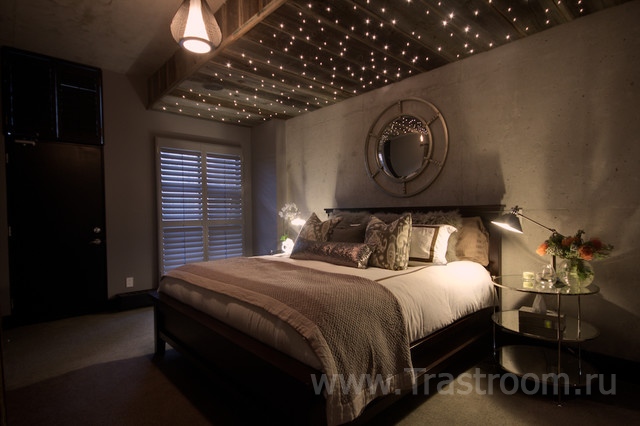 - звездное небо – очень популярный на сегодняшний день способ декорирования потолка в спальне, количество и свет звездочек можно регулировать;