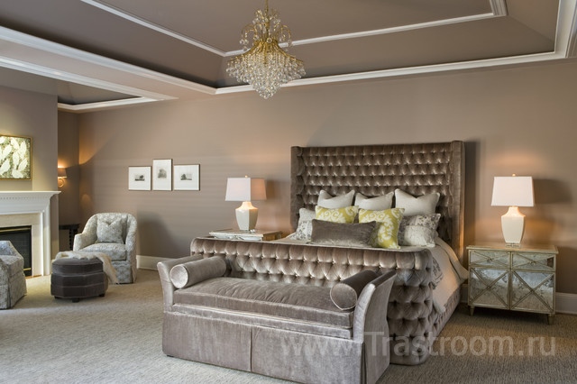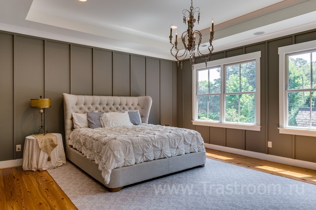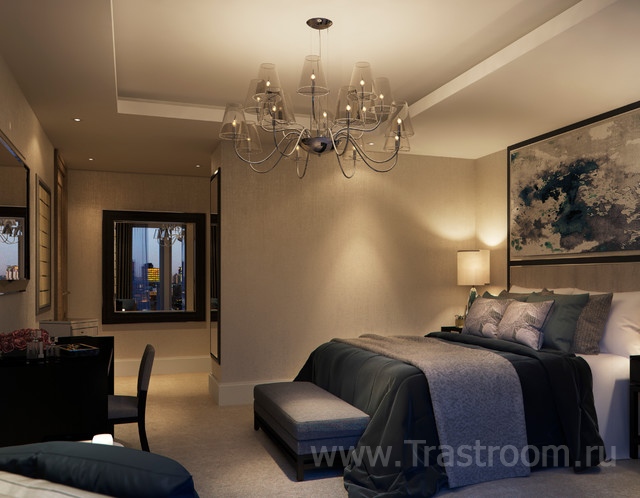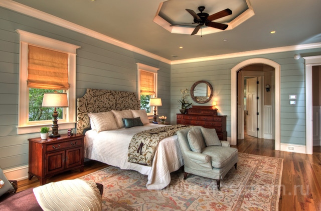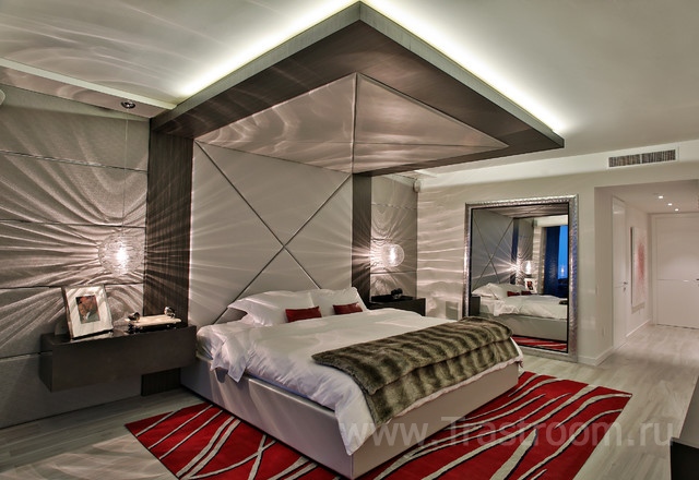 3) Спальня большой квадратуры не боится экспериментов с потолочной конструкцией – нижний ярус может быть клинообразной или округлой формы.
