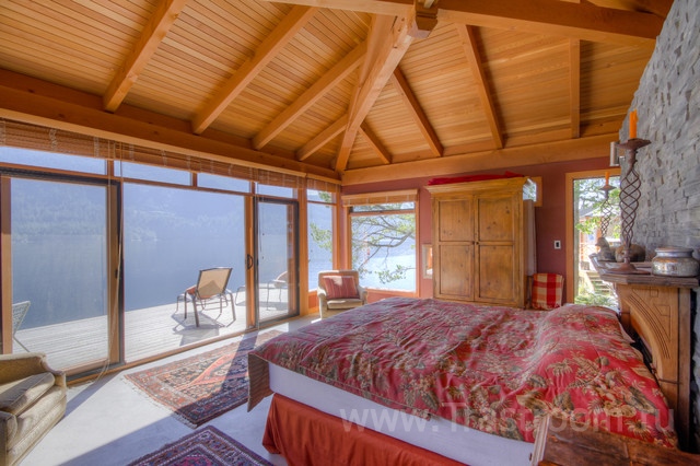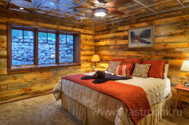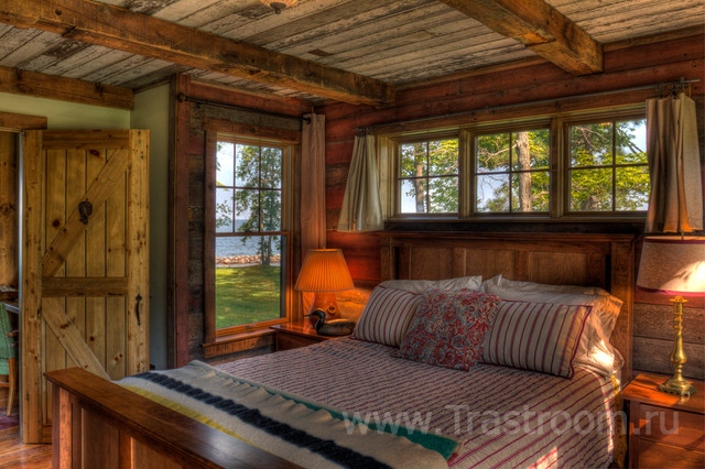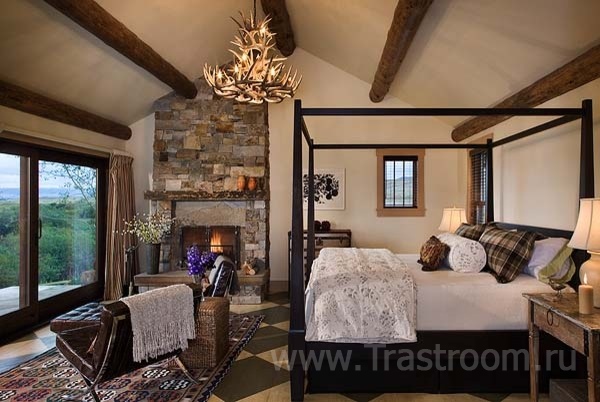 В спальной комнате акцентом выступает кровать, отталкиваясь от нее, формируют все остальное пространство. Кровать массивная, деревянная либо с элементами ковки, покрыта шерстяными клетчатыми пледами или ситцевыми одеялами с цветами.