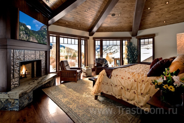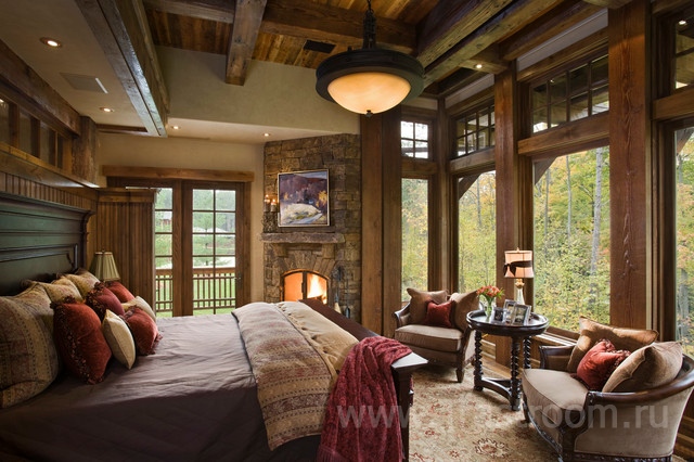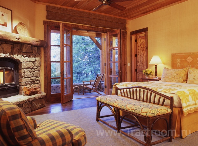 Что еще как не камин поможет передать настоящий деревенский дух. В интерьере спальни-кантри для обрамления камина пригодятся натуральные материалы – мрамор, гранит, песчаник, ракушечник. Дерево тоже может участвовать, предварительно обрабатываясь огнеупорным составом.