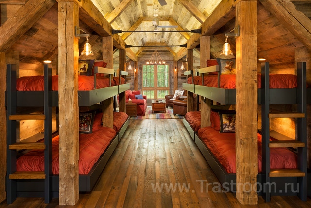 3) Русское – характеризуется грубоватой фактурой в отделке стен, потолков, пола. Для стен или мебели используют бревна, часто намеренно недостаточно обработанные или состаренные. Шторы, покрывала, ковры приобретают изо льна, хлопка, мешковины, овчины. Как обязательный элемент должны присутствовать клетка или мелкие цветочные рисунки, например, на наволочках. Если устанавливают камин – то в виде русской печи.