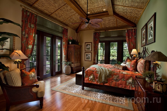 Прикроватную зону можно заполнить старинным тяжелым комодом или плетеными креслами, которые стоят на небольшом коврике из хлопка или овчины.