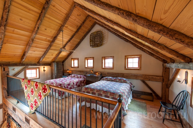 Потолки в деревенском стиле часто балочные. Использование балок светлых пород деревьев позволяет увеличить высоту комнаты, приподняв визуально потолок. Оригинально выглядит украшение потолочных балок резьбой или росписью.