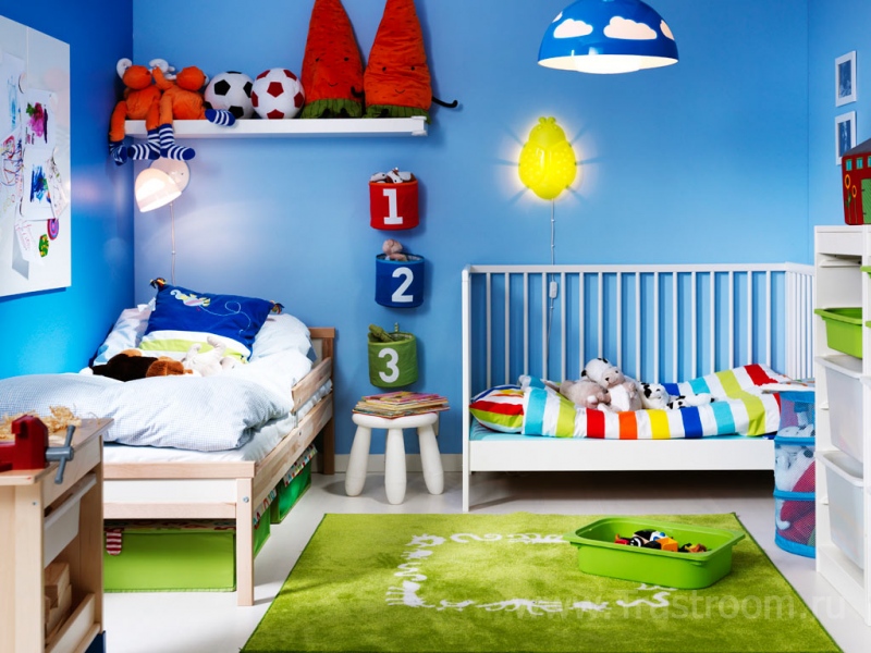 В принципе, новорожденному больше ничего и не надо. Но через год малыш уже будет активно развиваться, а значит ему будет нужен небольшой детский столик для рисования и других занятий, пустое место на полу с теплым и уютным ковриком для разнообразных игр. Впоследствии можно будет установить небольшую шведскую стенку, чтобы приобщать малыша к спорту.