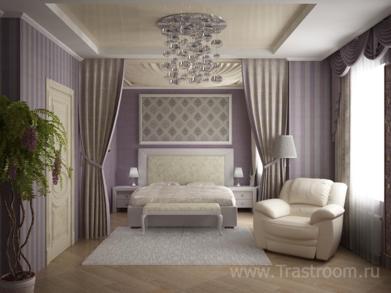 Для оформления подавляюще большой комнаты используют сочетания темных цветов, широкие вертикальные полосы обоев и различные вставки с орнаментами.