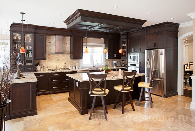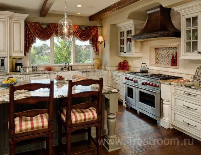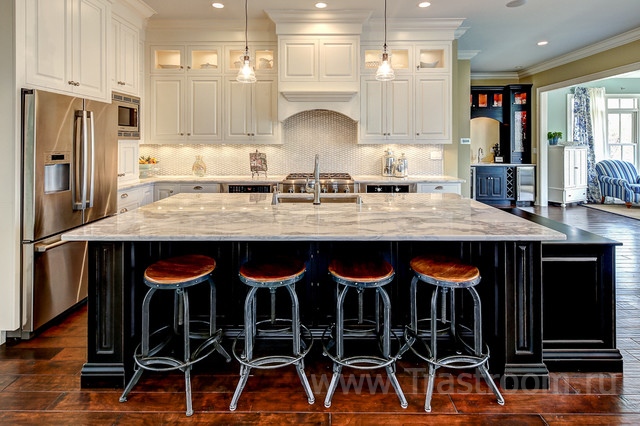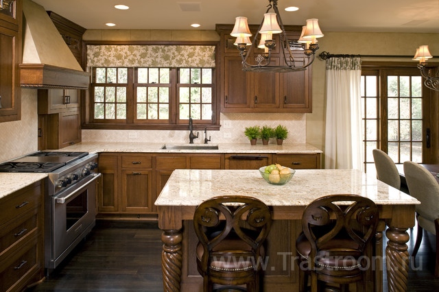 Мебель из экологичных, натуральных материалов, чаще всего используют массив дерева, тщательно обработанный, резной, отделанный и украшенный бронзой или позолотой, придающий помещению уютный и, вместе с тем, роскошный образ. В этом случае отдайте предпочтение деревянным барным стульям для кухни.