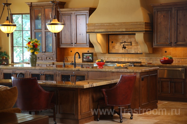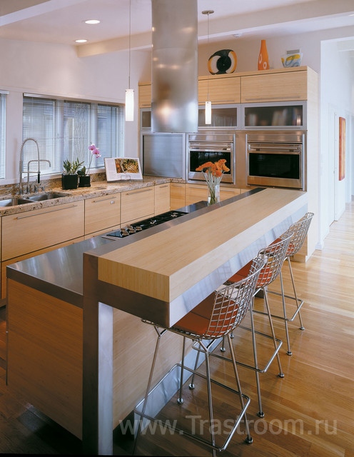 1) В стандартном исполнении барная стойка продолжает столешницу рабочей зоны, выступая предметом разделения общего квартирного или только кухонного пространства (в случае большой кухни) на разные функциональные участки. Располагается стойка обычно перпендикулярно по отношению к другим элементам мебели для оптимизации места внутри помещения.