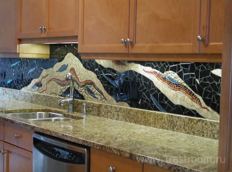 - Благодаря множеству мелких элементов из мозаики можно собрать уникальные рисунки и узоры, или же отобразить невероятные цветовые решения, которые придадут современной кухне в стиле эклектика еще больший шик.