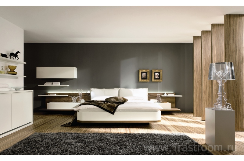 В спальне стиля модерн должны преобладать натуральные цвета, отделка, материалы