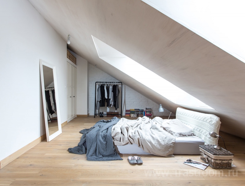 Много естественного освещения этой модерновой спальне достается за счет мансардных окон