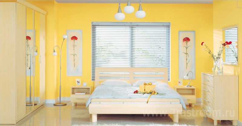 - Солнечно-желтые стены в спальне придадут комнате теплый колорит.