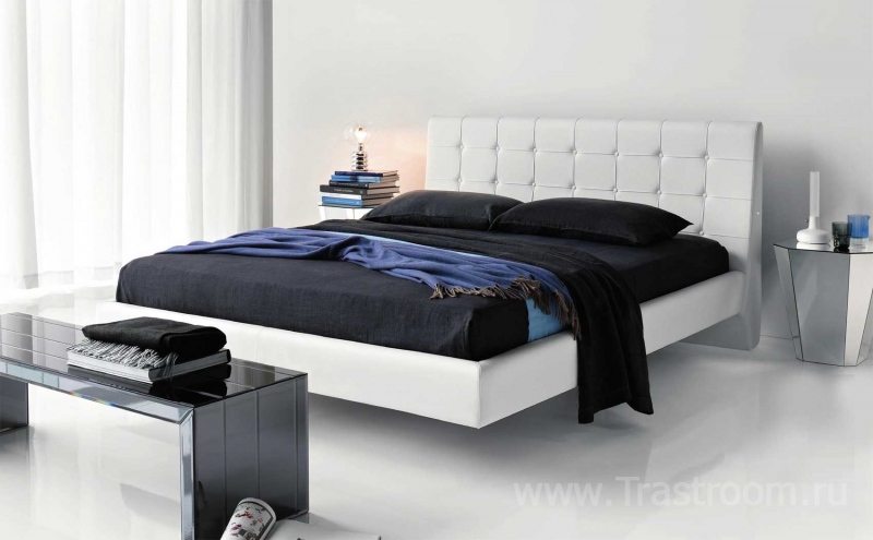 Парящая над полом кровать, оригинальная потолочная конструкция с подсветкой будут как нельзя кстати в современной спальне